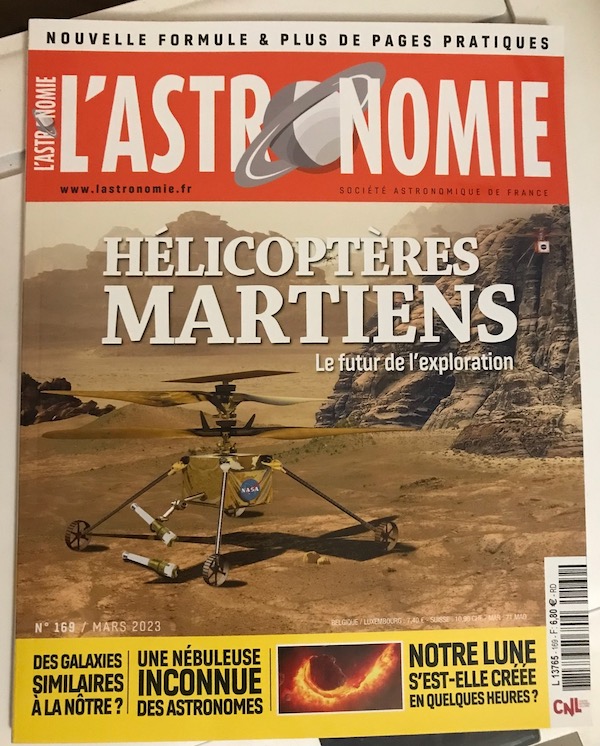 Couverture du numéro de mars 2023 de l’Astronomie dans lequel un dossier sur Ingenuity et ses successeurs a été traité alors que l’hélicoptère n’en était alors qu’à son 41ème vol.