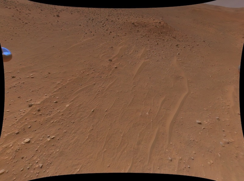 Photo prise par la caméra couleur d’Ingenuity au cours de son 50ème vol réalisé le 13 avril 2023 à une altitude de 18 mètres. L’extrémité d’un des quatre pieds d’atterrissage est visible sur la gauche du cliché. L’horizon est visible en haut à droite. Crédit : Nasa/JPL