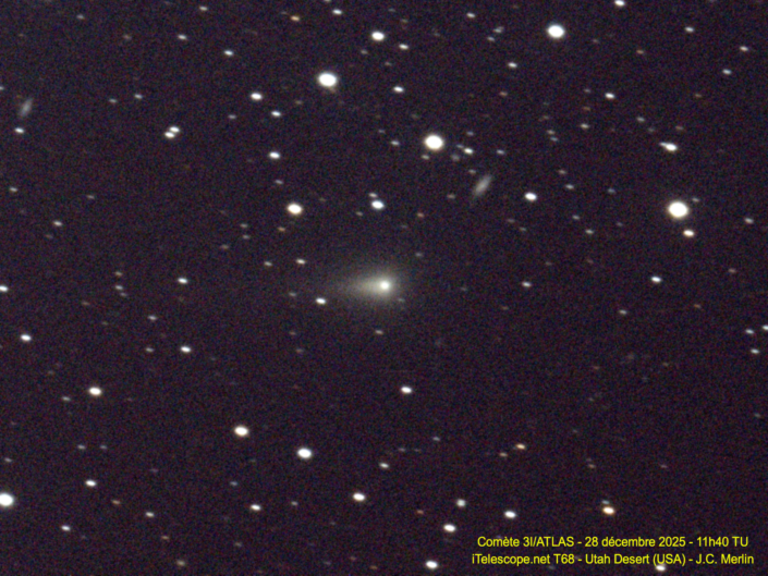 Cérès est une planète naine (~ 476km de rayon moyen) dans la ceinture des astéroïdes, découverte en 1801. Elle porte le nom de la déesse romaine de l’agriculture, des moissons et de la fertilité. Durant le mois de mars 2023, Cérès traverse l’amas de la Vierge, une occasion à ne pas manquer pour la photographier. Le 15 mars 2023 : Lunette 61EDPH EOSRA LPro – 160x1min à 3200iso (pour avoir aussi les galaxies), l’empilement des images et l’alignement sur les étoiles donnent un petit haricot blanc : Cérès. La vidéo associée ne laisse aucun doute … Quelques données à ce moment : distance /au soleil : 2,56 UA, distance / à la Terre :1,6UA, magn: 7,5. Crédit : Jean Moucaud