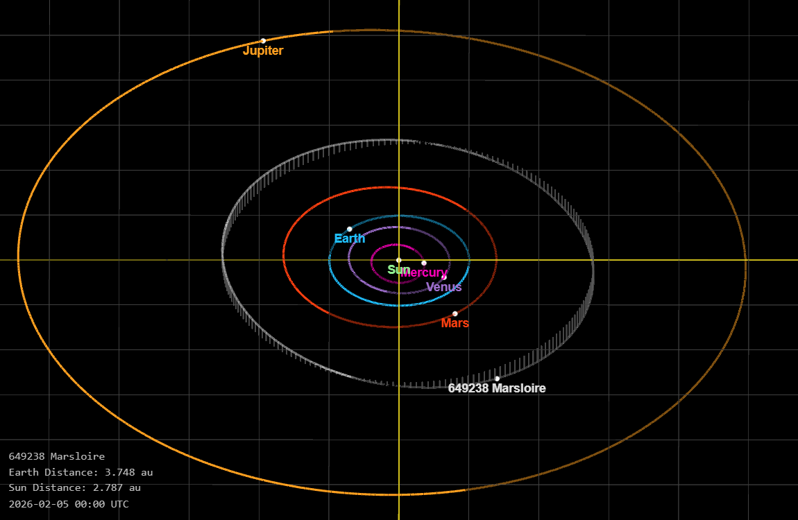 Le schéma joint issu de la page du JPL positionne l’orbite de l’astéroïde (649238) Marsloire par rapport aux planètes de Mercure à Jupiter.