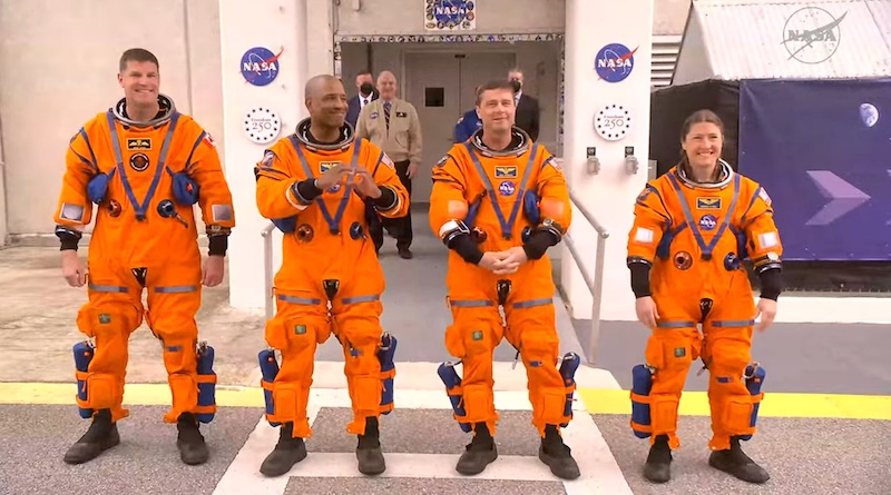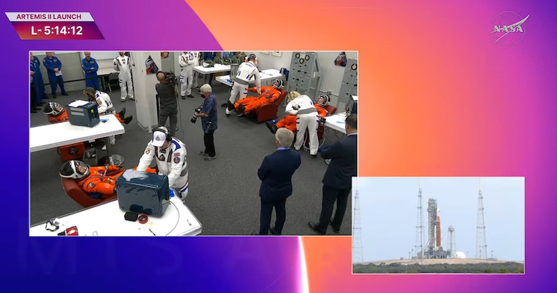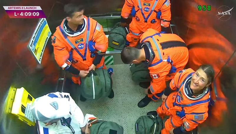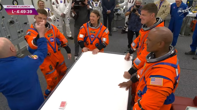 Après l’habillement, la traditionnelle partie de cartes avec le Directeur des Astronautes Scott Tingle, l’équipage a quitté le quartier des équipages pour se rendre sur le Pad 39-B où les attendait le SLS et leur capsule Orion.