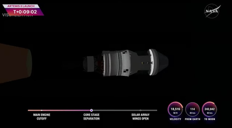 L’équipage est arrivé très détendu au pied du SLS pour s’installer à bord de la capsule Integrity. La fenêtre de 2 heures est là pour permettre de gérer les incidents. Et ça a été le cas : à T-10 min, le compte à rebours a été interrompu pour vérifier un des deux capteurs de chaleur de la tour de sauvetage afin de déterminer si c’était juste le capteur qui faisait des siennes ou si c’était un problème dû à la batterie de celui-ci. Après un examen approfondi, tout était opérationnel, et comme nous étions dans la période impartie de la fenêtre, cela n’a eu aucun impact ! Le lancement s’est déroulé normalement. Le compte à rebours est reparti, et le décollage a eu lieu à 18 h 35 min 12 sec local (soit 00h35 chez nous).