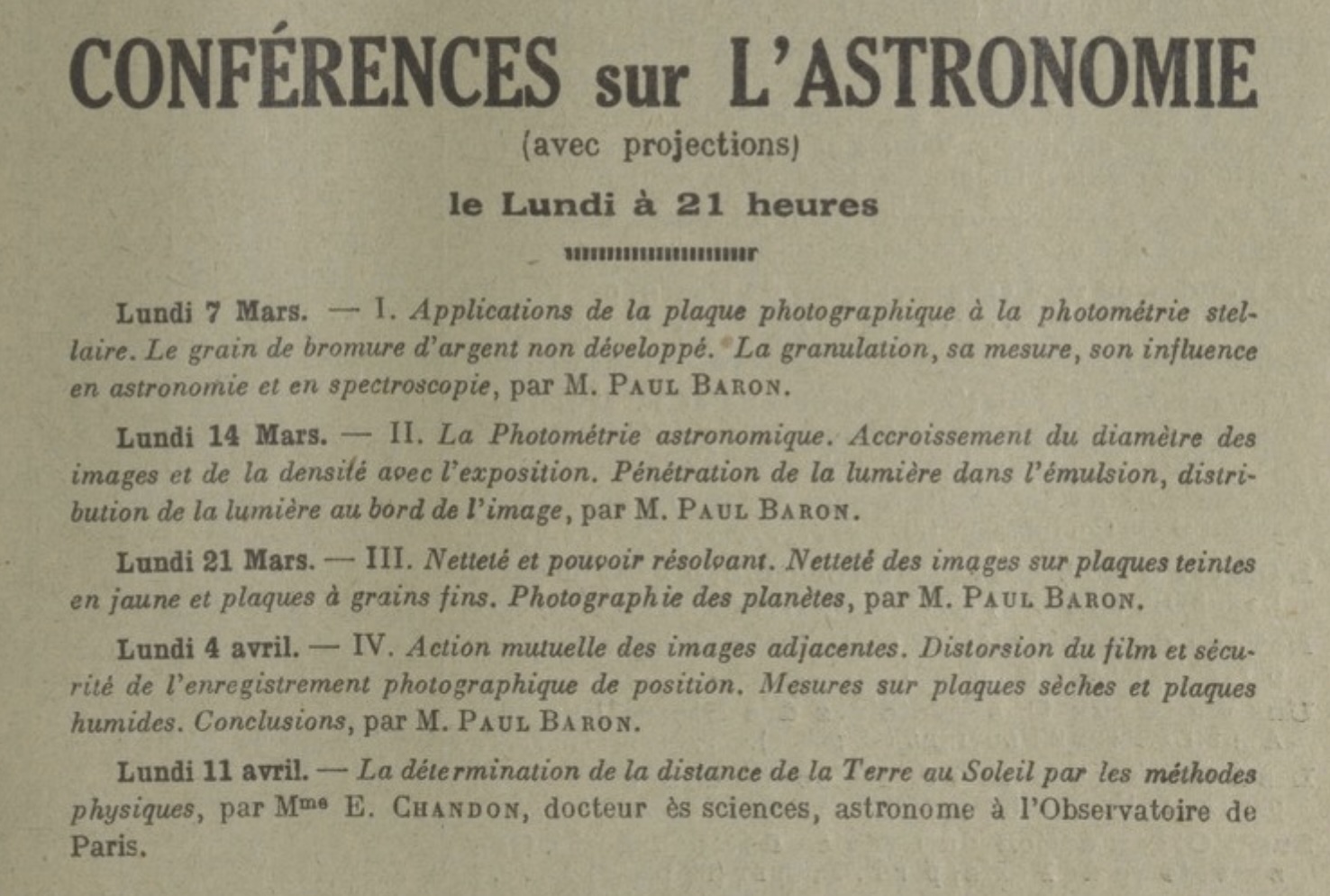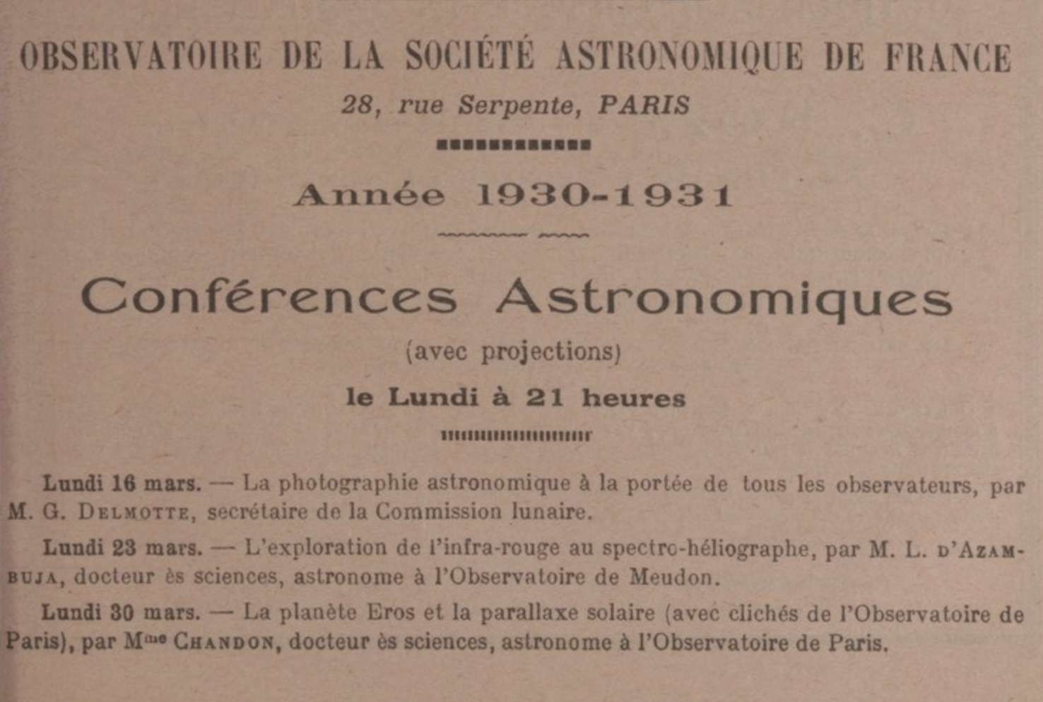 Edmée Chandon faisait partie des conférenciers de la SAF en 1931 et 1932. Crédit : l’Astronomie