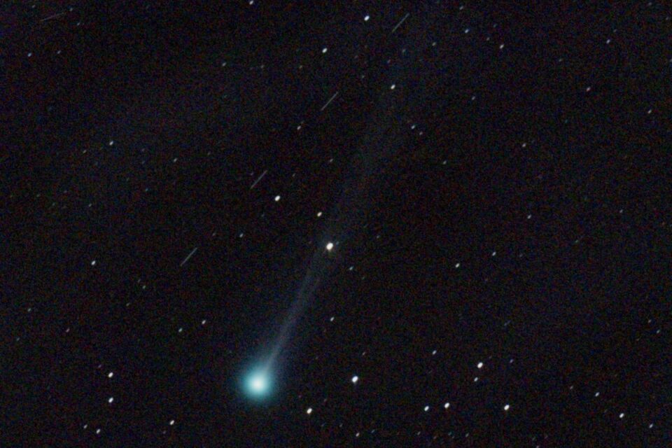 La comète C/2025 R3 le 6 avril 2026 à 6h01. Photo prise en Touraine au téléobjectif (champ de 4.3°). 2,5 minutes de pose. Crédit : Nicolas Biver