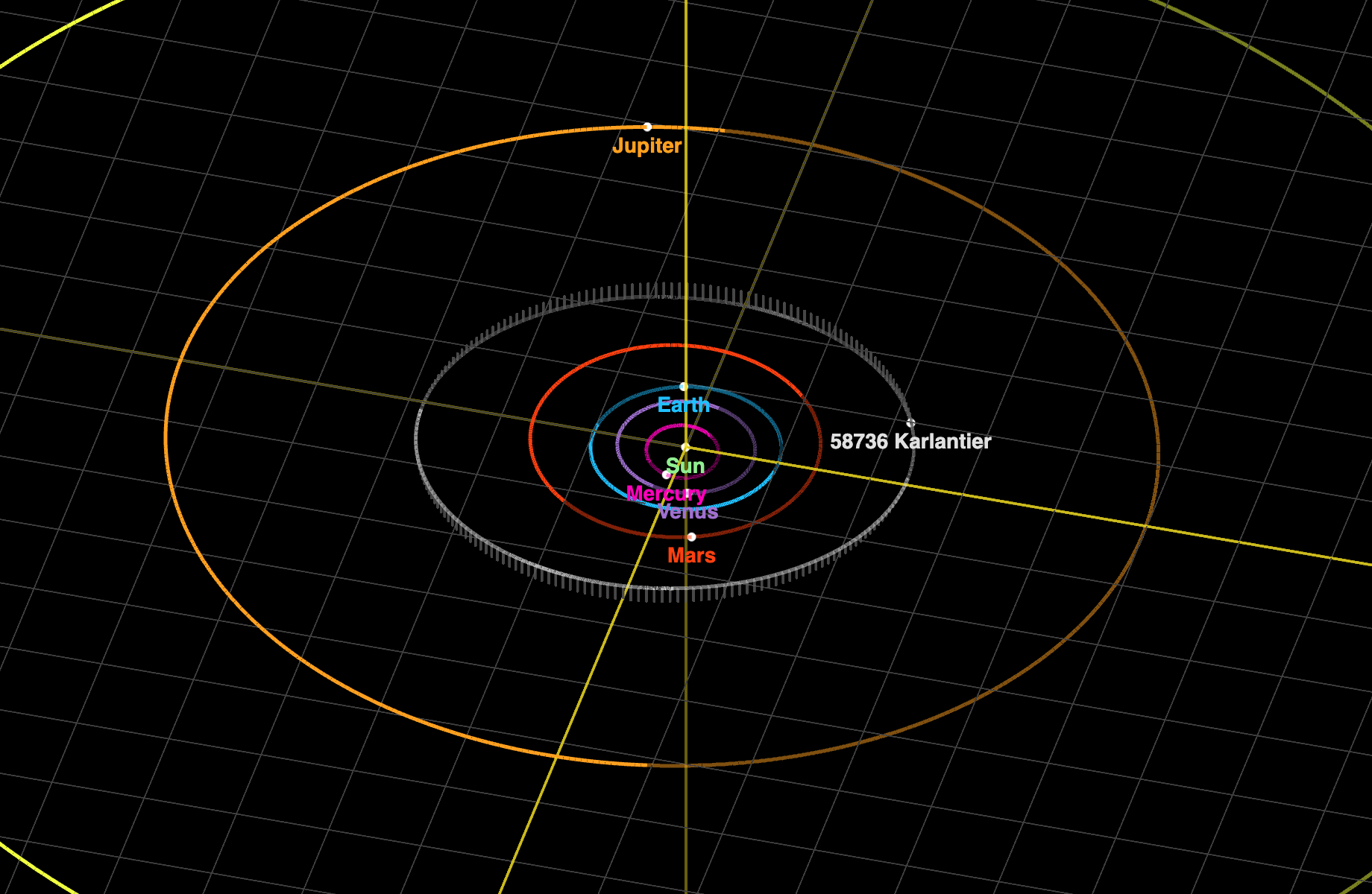 Orbite de l’astéroïde (58736) Karlantier et position au 7 janvier 2026. Source : JPL Small Body Database