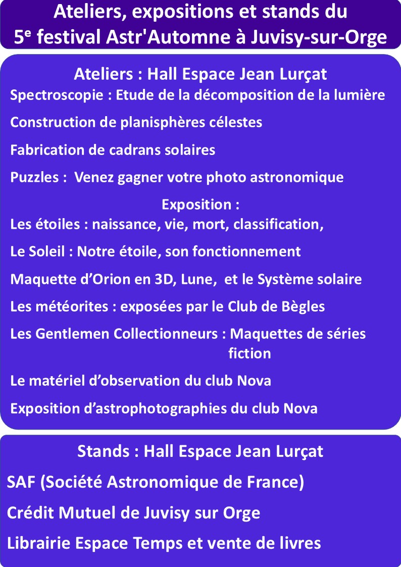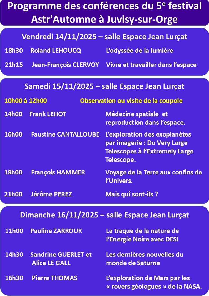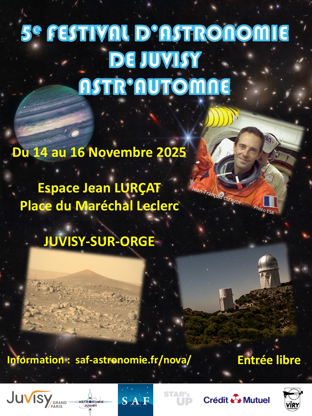 Juvisy accueil le 5e festival d’astronomie : Astr’Automne. Organisé par le club Nova Astronomie Juvisy, il se tiendra les 14, 15 et 16 novembre 2025 à l’Espace Lurçat. Par ses activités, ce groupe de « mordus du ciel » a pour vocation de mettre gratuitement à la portée de tous, la connaissance de l’Univers et de l’espace avec l’intervention d’astronomes professionnels et plus rarement de spationautes.