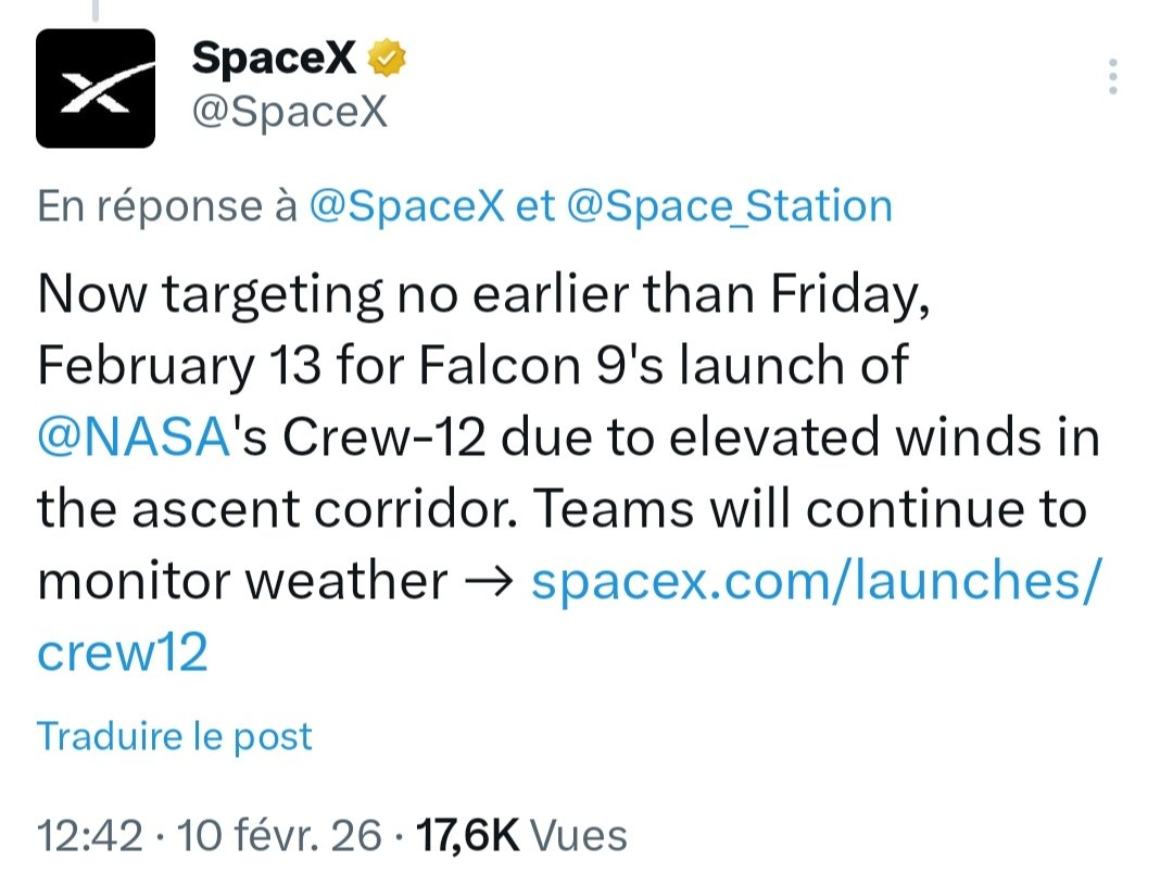 Initialement prévu le 11 février à 12h01 heure de Paris (06h01 locale), la NASA a d’abord reporté une première fois le décollage au jeudi 12 à 11h38 (Paris) à cause de mauvaises conditions météorologiques sur le couloir ascendant de la capsule – en cas de retour d’urgence lors du décollage, les conditions optimables ne sont pas réunies pour un retour en mer et la récupération de la capsule Freedom avec son équipage. Et ce mardi soir, la NASA annonce que les conditions météorologiques ne se sont pas améliorées et a donc encore reporté le décollage à vendredi 13.